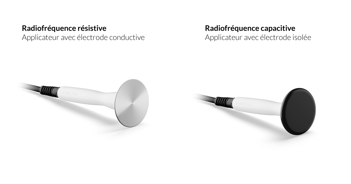 - radiofréquence capacitive : avec une électrode entourée d'un matériau isolant, la charge électrique va se concentrer sous l'applicateur permettant le traitement des couches supérieures de la peau et un ciblage précis.