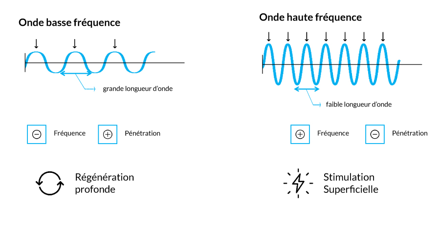 Les dispositifs TECAR mobilisent des basses fréquences comprises entre 300 et 500 kHz, à la différence des appareils de radiofréquence classiques qui utilisent des moyennes fréquences de l'ordre de 1 à 10 MHz. Plus la fréquence est basse, plus la longueur d'onde est importante. Les basses fréquences ont la particularité de pénétrer plus profondément dans le tissu. Elles sont idéales pour le traitement de la cellulite et la régénération en profondeur de la peau.